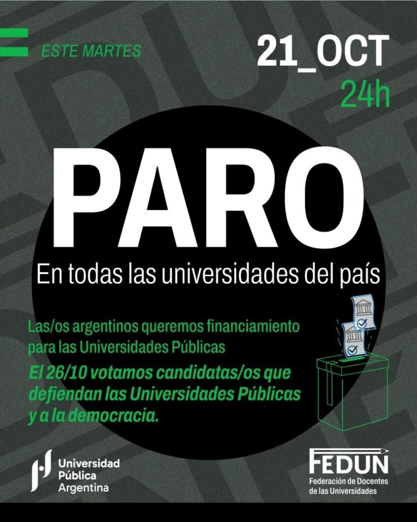 Por último, los gremios llamaron a la comunidad universitaria y a los estudiantes a sumarse a las manifestaciones. “En unidad junto al CIN, los estudiantes y otras representaciones gremiales seguiremos en lucha, en defensa de nuestros derechos y de las banderas de la Universidad Pública, gratuita, de calidad y al servicio de los pueblos”, afirmaron en un comunicado conjunto. La Fedun también instó a “votar el próximo 26 de octubre a los candidatos que defiendan a las universidades públicas y la democracia”.