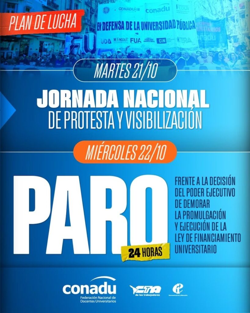 El plenario de gremios universitarios realizado el viernes pasado resolvió, por unanimidad, convocar a una jornada de protesta el martes 21 de octubre y a un paro nacional el miércoles 22. En simultáneo, la Conadu Histórica anunció una huelga de 48 horas durante las mismas fechas, mientras que la Federación de Docentes de las Universidades (Fedun) se sumará con un paro de 24 horas.