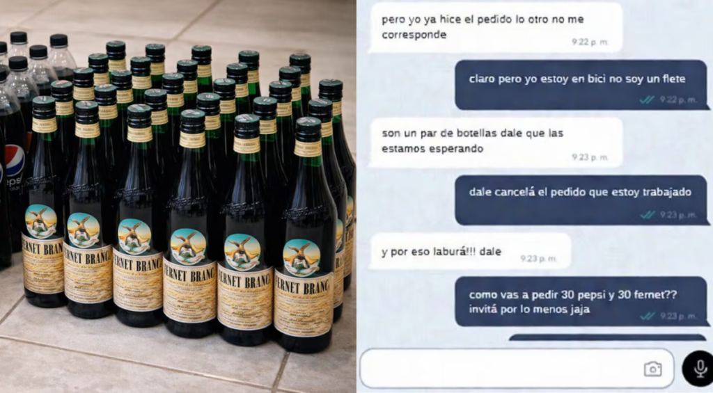 El ida y vuelta comenzó cuando el delivery le pidió al usuario que cancelara un encargo de 30 gaseosas colas y 30 fernets, ya que le resultaba imposible trasladarlo. “No te puedo alcanzar el pedido, es muy grande y estoy en bici”, le explicó.