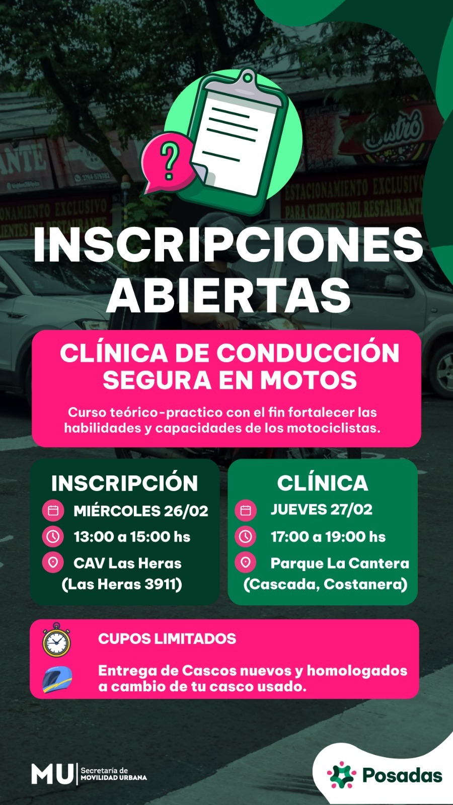 El miércoles 26 de febrero, de 13 a 15 horas se realizarán las inscripciones a la Clínica de Conducción Segura en Moto, en el Centro de Atención al Vecino «Las Heras», ubicado en avenida...